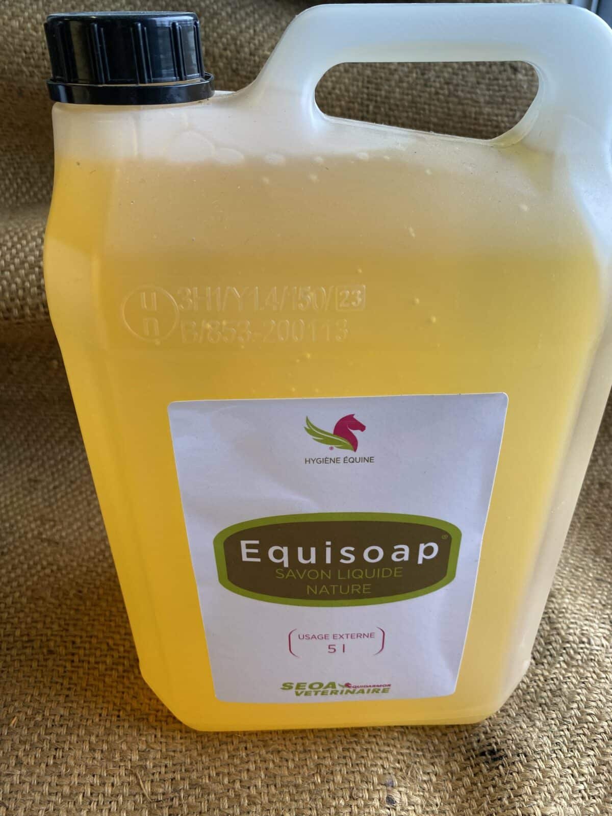 EQUISOAP de SEOA est un savon de Marseille liquide préconisé pour le nettoyage de la peau du cheval par exemple avant un traitement ou du fourreau.